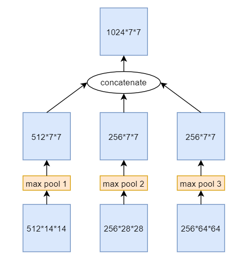 Spatial partial pooling(SPP)常被添加与CNN的尾部,比如目标检测的Neck部分,用于融合不同层的特征并将其池化至同一尺寸。SPP的过程如下图所示: